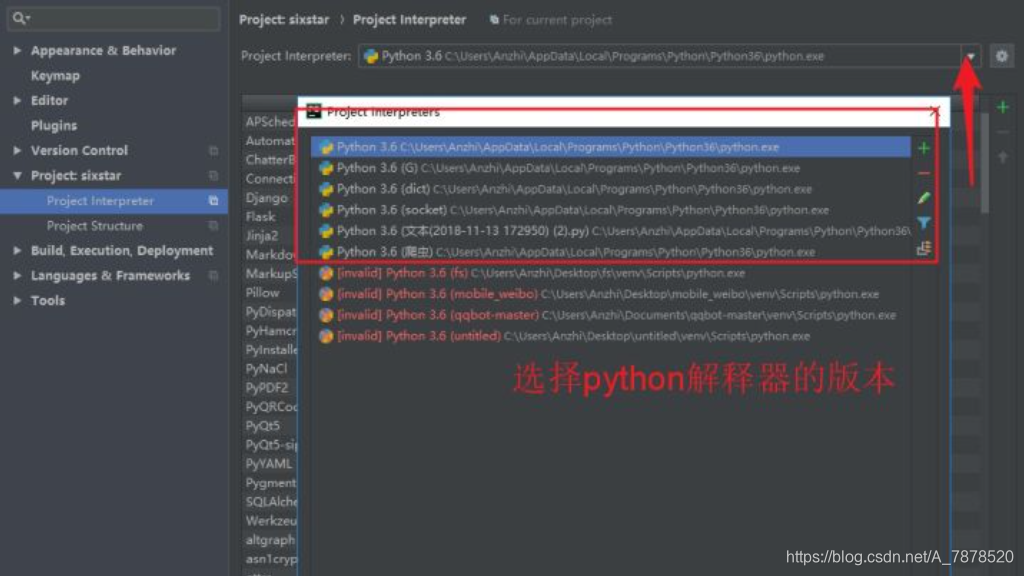 - Project:当前项目名>Project Interpreter>点击右侧绿色小加号