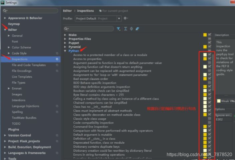 选择File---settings---Editor---选中Inspections,在右边框中选择Python