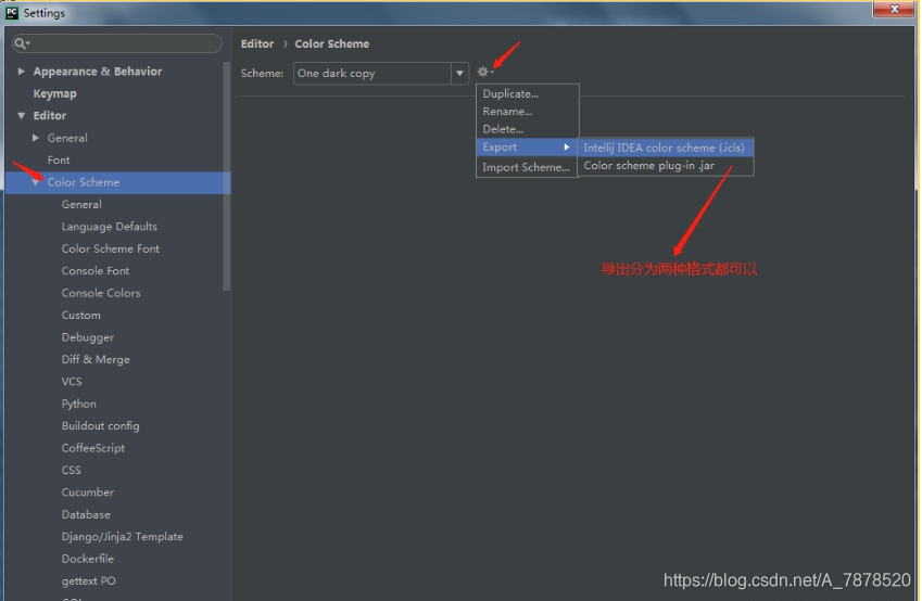选择File---settings---Editor---选中Color Scheme,在Scheme栏进行导出